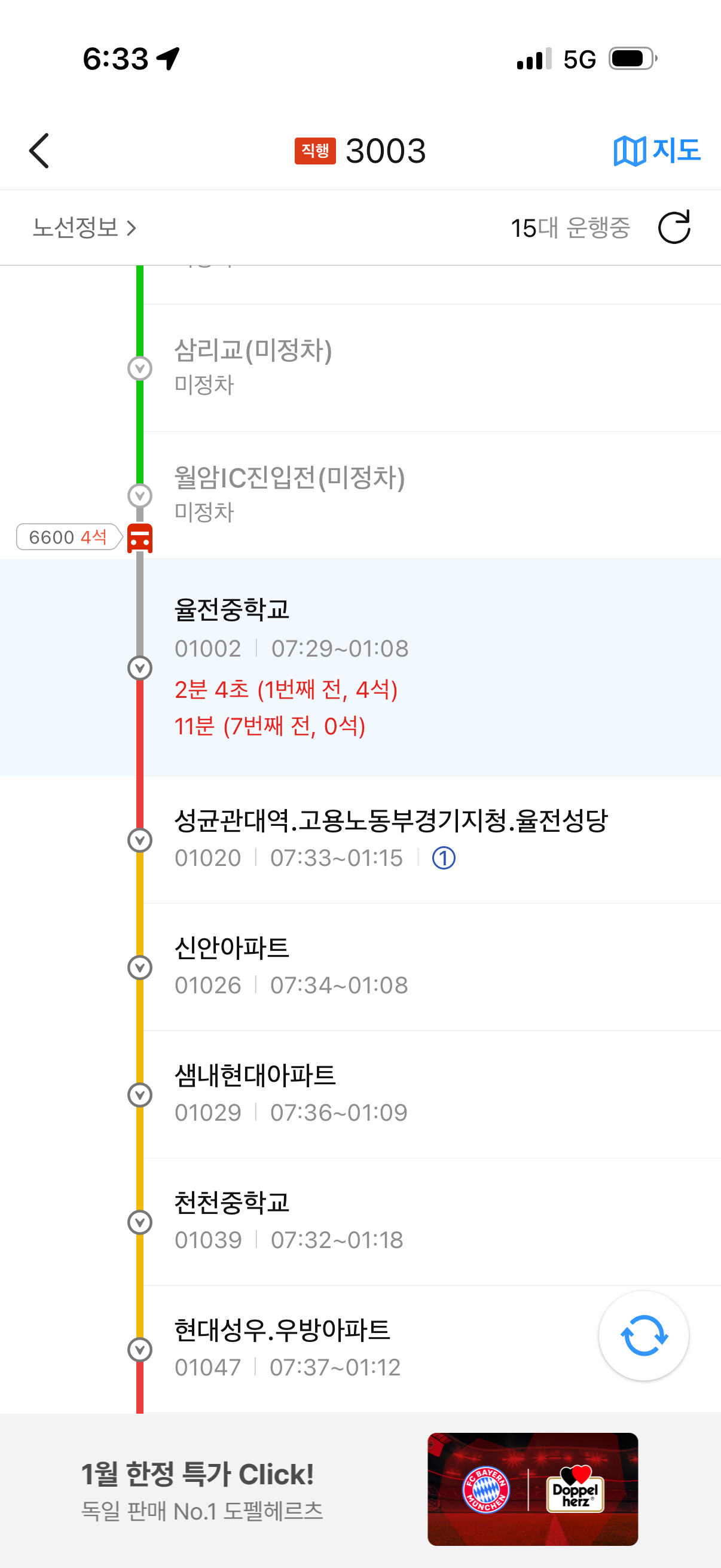 1/15(목) 저녁 6시 36분에 율전중학교 정류장(01002) 도착하신 3003 여성 기사님 넘 친절하셔서 퇴근길에 기분이 좋아졌어용